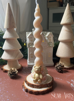 lluminez votre Noël avec notre bougie cierge de Noël en cire de soja, décorée à sa base d'un adorable ourson doré des cadeaux et de sapins pailletés. Une création unique et artisanale pour une ambiance chaleureuse et festive.